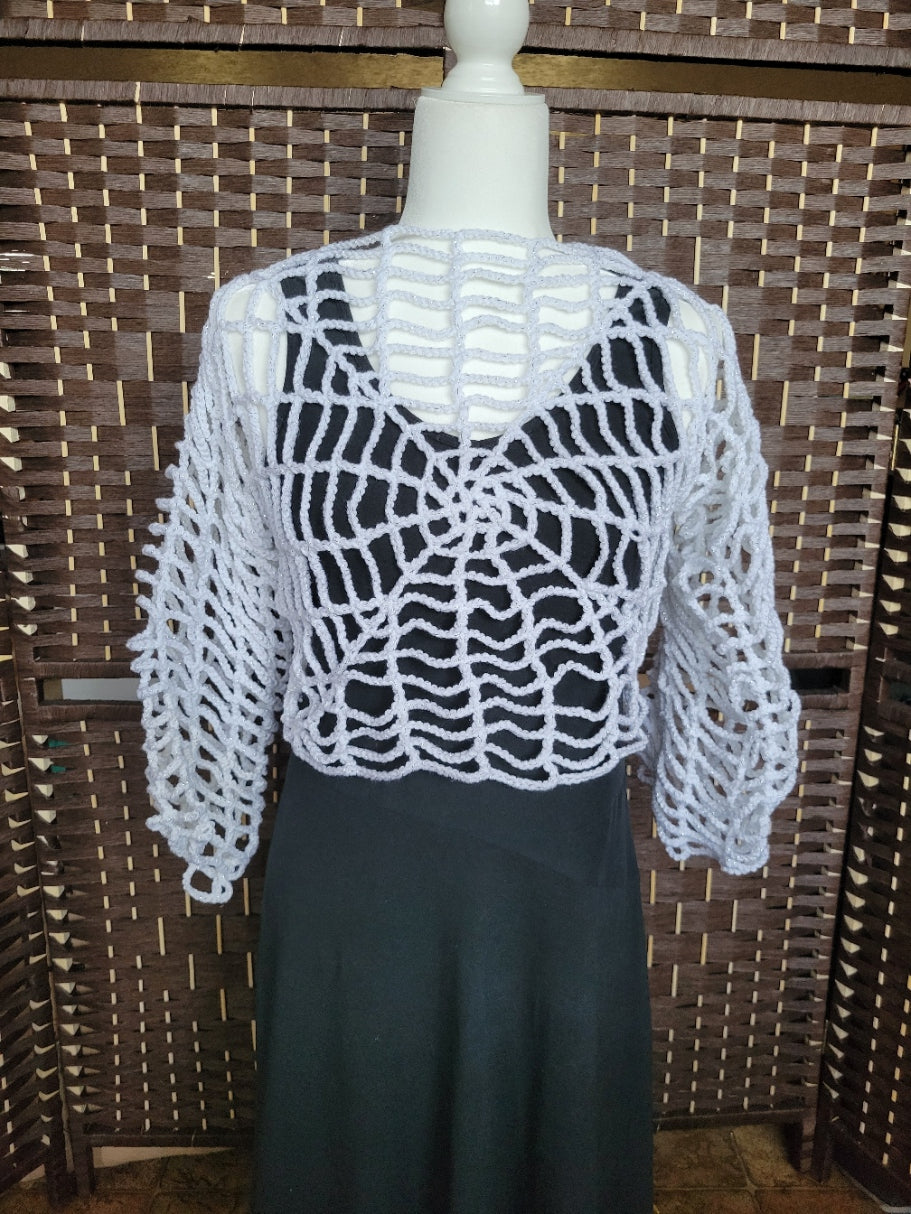 Get into the Halloween spirit with this stunning and unique crop top! Pair it with dark colors to create a striking contrast that will turn heads. Handcrafted from sparkly white yarn, this crocheted masterpiece not only ensures you’ll stand out during festivities, but it also feels incredibly soft against your skin. Plus, it's a breeze to care for! Just toss it in a mesh bag and put it in the washing machine—then air dry for effortless maintenance. Elevate your Halloween wardrobe and dazzle at every party with this fabulous top! Don’t miss out on the chance to make a memorable impression this season!